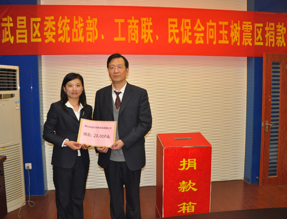4月27日下午,武昌区委统战部、工商联、民促会向玉树灾区捐款活动在武昌慈善总会举行。永业行副总裁、党委副书记靳剑辉代表公司全体员工将捐款交给武昌慈善总会,为玉树奉上一片爱心。