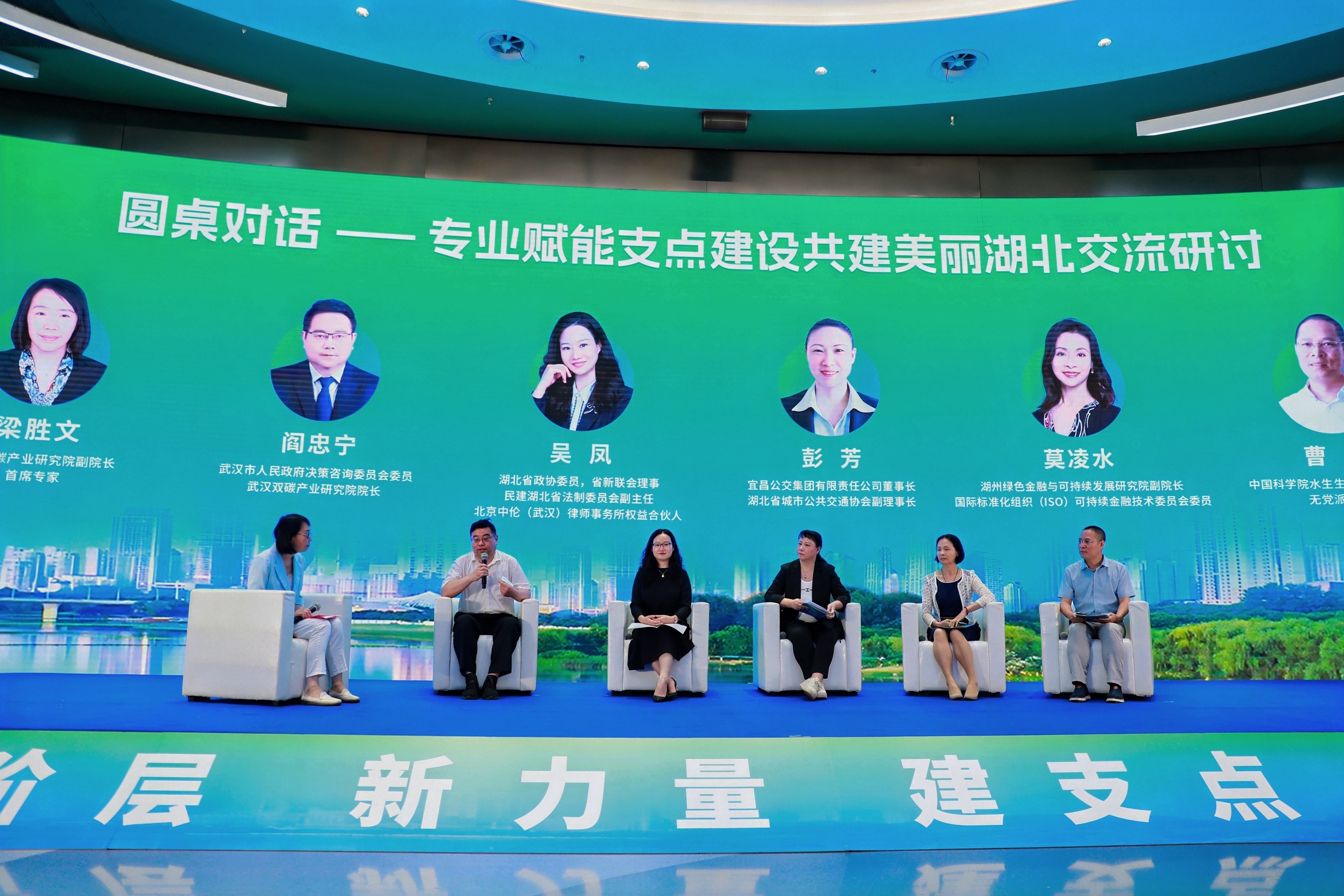 武汉双碳产业研究院副院长、首席专家梁胜文主持本环节。会议邀请武汉市人民政府决策咨询委员会委员,武汉双碳产业研究院院长阎忠宁;湖北省政协委员,省新联会理事,民建湖北省法制委员会副主任,北京中伦(武汉)律师事务所权益合伙人吴凤;宜昌公交集团有限责任公司董事长,湖北省城市公共交通协会副理事长彭芳;湖州绿色金融与永业行研究院副院长,国际标准化组织(ISO)可持续金融技术委员会委员莫凌水;中国科学院水生生物研究所研究员,无党派人士曹特等五位专家参加圆桌对话,围绕新阶层专业赋能支点建设共建美丽湖北交流研讨。